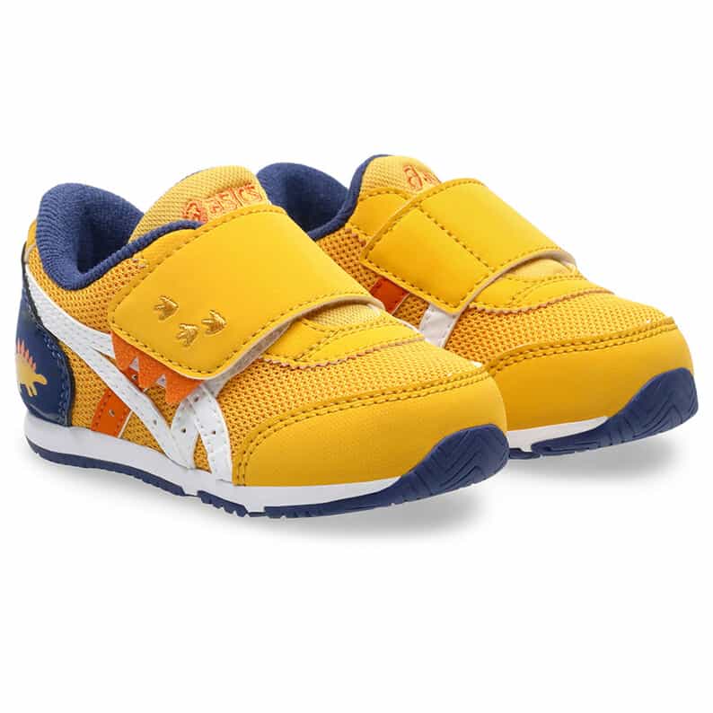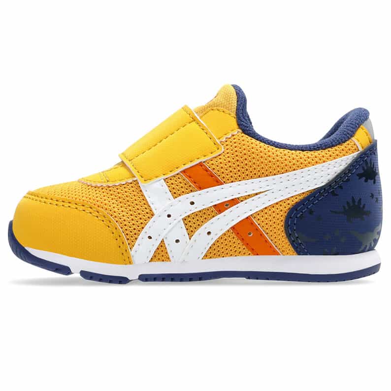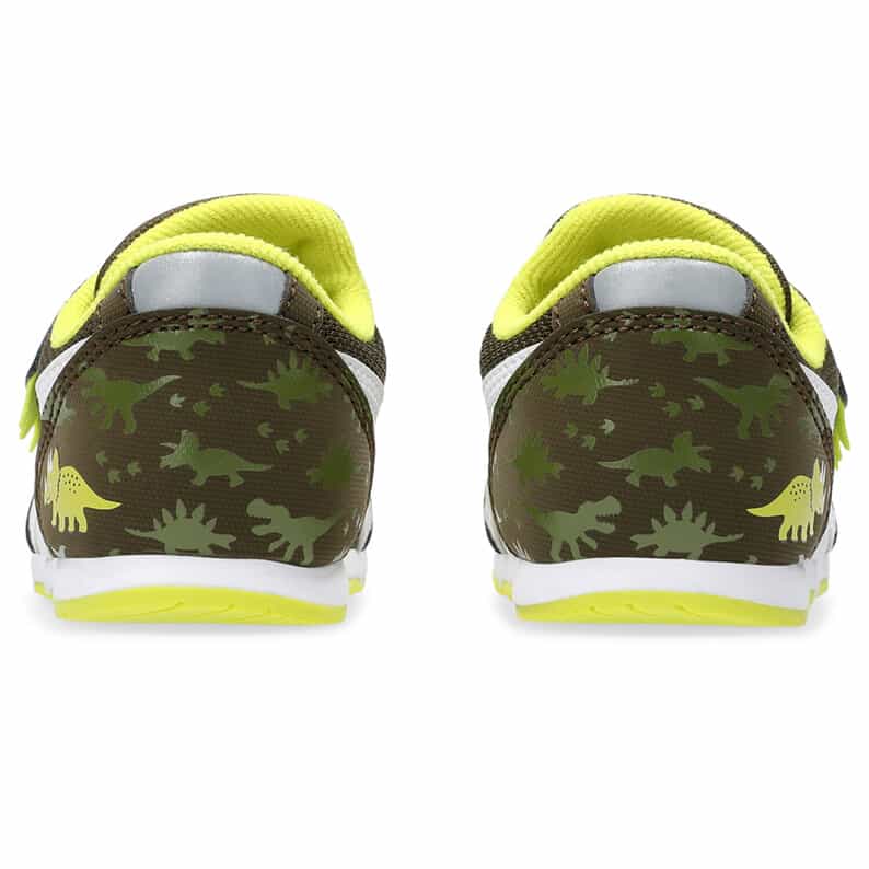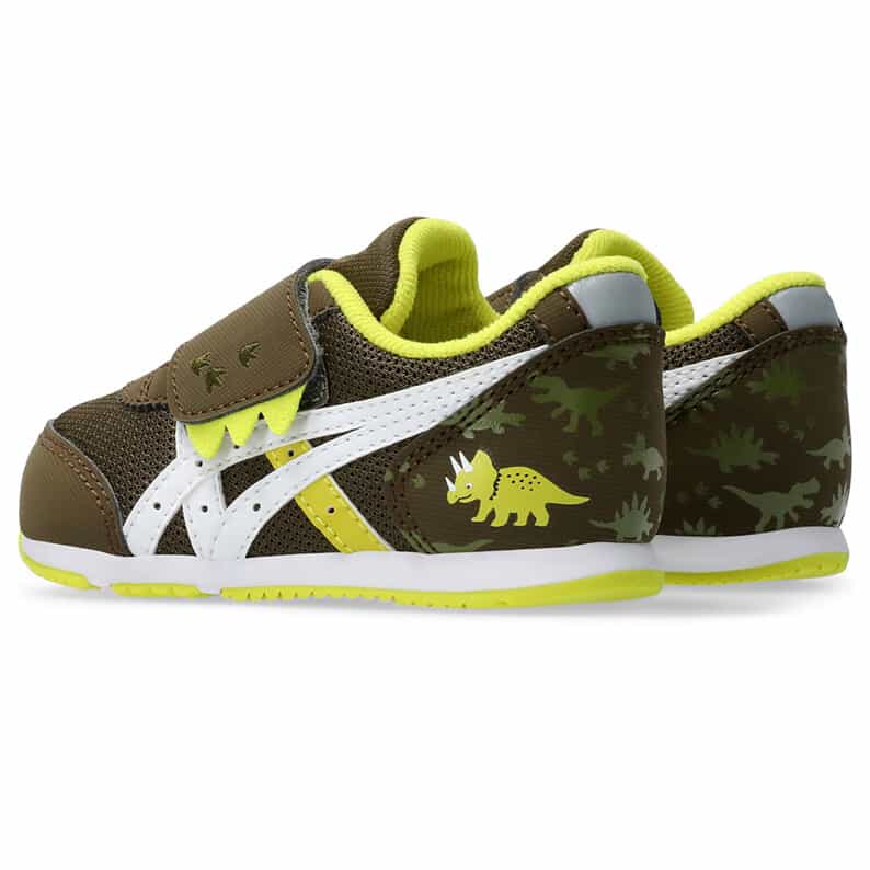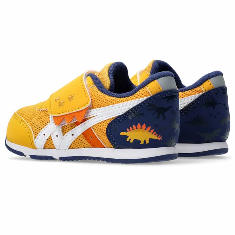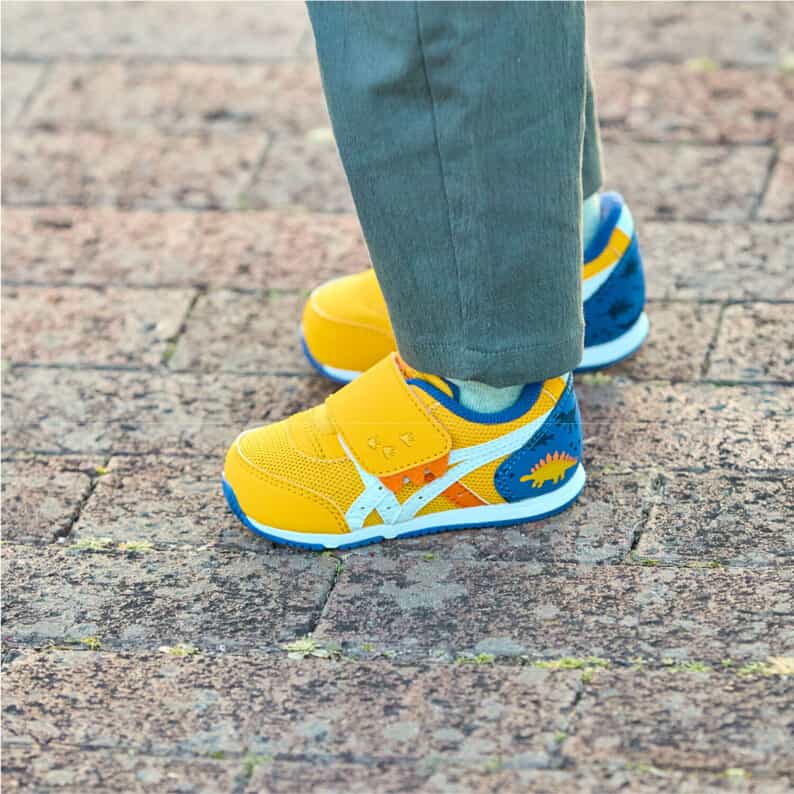 約1歳から3歳の幼児向けに展開する「BABY」シリーズのローカットシューズ。子どもたちの大好きな恐竜をモチーフにした、遊び心のあるアイテムです。扇形のつま先部分は足ゆびをのびのびと動かすことができ、踏ん張りやすいのが特徴です。アウターソールは、足の屈曲位置に合わせて溝を配置した「フレックスグルーヴ」を採用。足の動きにしなやかに追従します。かかとの安定性を重視し、かかとを包み込む立体的なインナーソールを使用しています。インナーソールの表面材には抗菌・消臭効果のあるシャインアップと、汗をすばやく吸収・拡散してドライ感を保つウォーターマジックを採用。靴の中を快適に保ちます。甲の内側を1枚の布で包み込むような構造のキモノフィットタンにより、フィット感を高め、アーチ部の倒れ込みを抑えます。アッパーは通気性に優れたラッセルメッシュを使用。