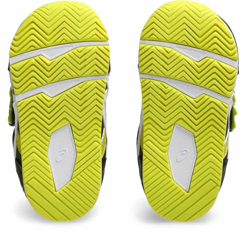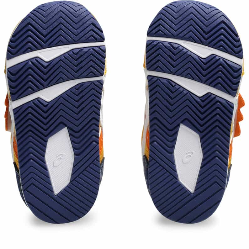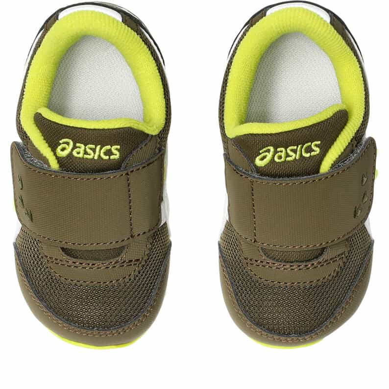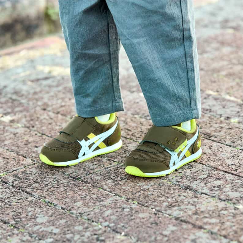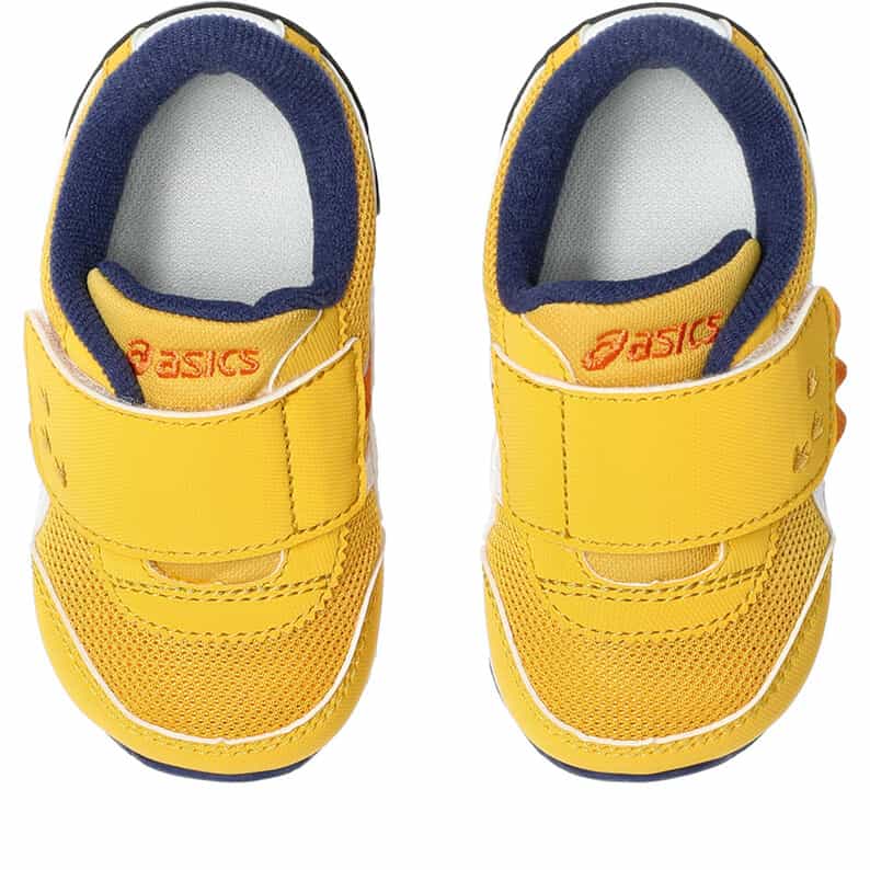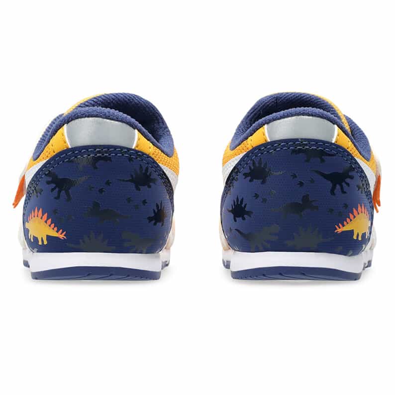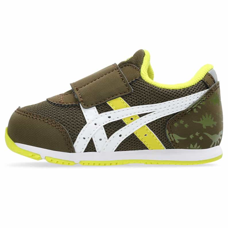 約1歳から3歳の幼児向けに展開する「BABY」シリーズのローカットシューズ。子どもたちの大好きな恐竜をモチーフにした、遊び心のあるアイテムです。扇形のつま先部分は足ゆびをのびのびと動かすことができ、踏ん張りやすいのが特徴です。アウターソールは、足の屈曲位置に合わせて溝を配置した「フレックスグルーヴ」を採用。足の動きにしなやかに追従します。かかとの安定性を重視し、かかとを包み込む立体的なインナーソールを使用しています。インナーソールの表面材には抗菌・消臭効果のあるシャインアップと、汗をすばやく吸収・拡散してドライ感を保つウォーターマジックを採用。靴の中を快適に保ちます。甲の内側を1枚の布で包み込むような構造のキモノフィットタンにより、フィット感を高め、アーチ部の倒れ込みを抑えます。アッパーは通気性に優れたラッセルメッシュを使用。