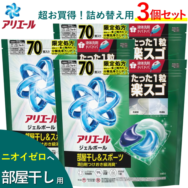 【70個入×3個セット】アリエール ジェルボール プロ 部屋干し用 210個 入 P&G 詰め替え 洗剤 洗濯洗剤 ARIEL Gel Ball 消臭 抗菌 ジェルボールプロ