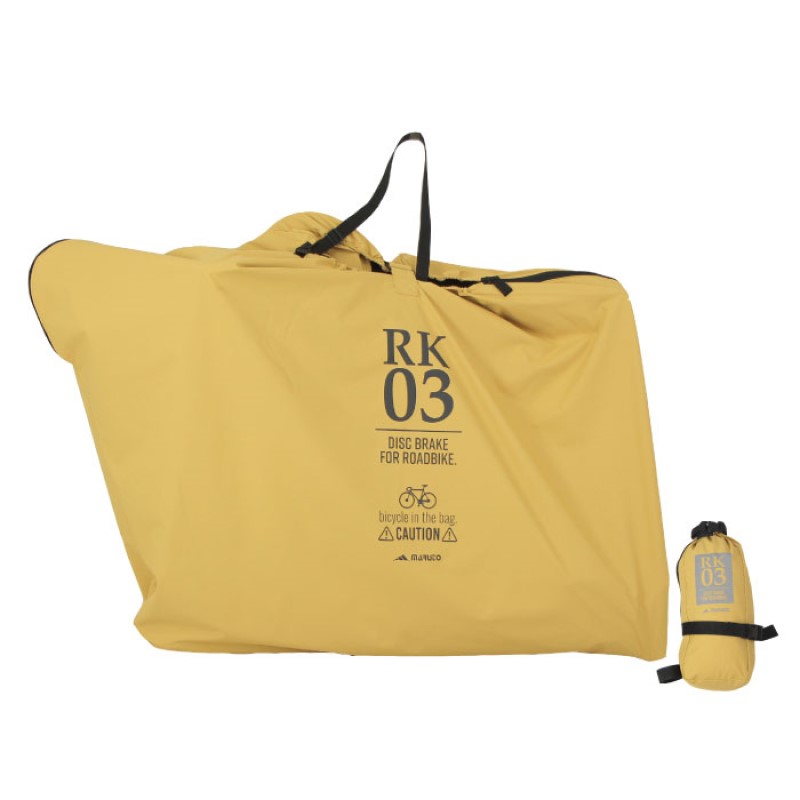 「ディスクロード」にスポットを当てて開発されたツアーバックがRK-03DRです。RK-03DRはディスクロードを輪行する時に必要となるアイテムが全て付属しています。スプロケットカバーとディスクローターカバーは色分けされており、誤装着を防ぎます。生地は裏地をTPUラミネートしたポリエステルで、しわになりにくく柔らかな肌触りで、また生地の耐水圧が10000m/m以上あるので、濡れた自転車を自動車内に積載する時に使用すると車内が濡れることを抑えられます。収納袋は、サドルバッグのようにサドルレールとシートポストの2点でしっかり車体に固定できます。RKシリーズはハンドルを切らずに輪行できるため、エアロロードにもおすすめです。