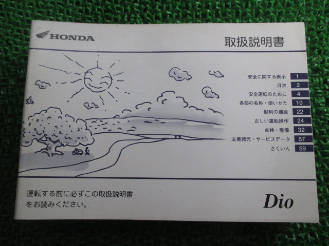 こちらの商品はディオの取扱説明書となっております。 写真でご覧の通り少々使用感はございますが、利用上問題となる 油による【字の消え】破れによる【ページの欠損】等はございません。 簡易的な各部の整備・調整方法なども記載されております。 買取査定時に取扱説明書や純正工具の有る無しは買取金額に大きく影響しますよ! ちょっとした事ですが、愛車の付加価値を上げる為に揃えておきましょう! 取扱説明書は整備時にあると役立ちますしね♪ メーカー:ホンダ 対応車種:ディオ 発行:2005年6月 即日発送いたしますのでお急ぎの方どうぞ ※お届けする商品は写真に写っている物が全てです。