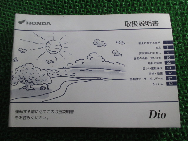 こちらの商品はディオの取扱説明書となっております。 写真でご覧の通り少々使用感はございますが、利用上問題となる 油による【字の消え】破れによる【ページの欠損】等はございません。 簡易的な各部の整備・調整方法なども記載されております。 買取査定時に取扱説明書や純正工具の有る無しは買取金額に大きく影響しますよ! ちょっとした事ですが、愛車の付加価値を上げる為に揃えておきましょう! 取扱説明書は整備時にあると役立ちますしね♪ メーカー:ホンダ 対応車種:ディオ 発行:2005年6月 即日発送いたしますのでお急ぎの方どうぞ ※お届けする商品は写真に写っている物が全てです。