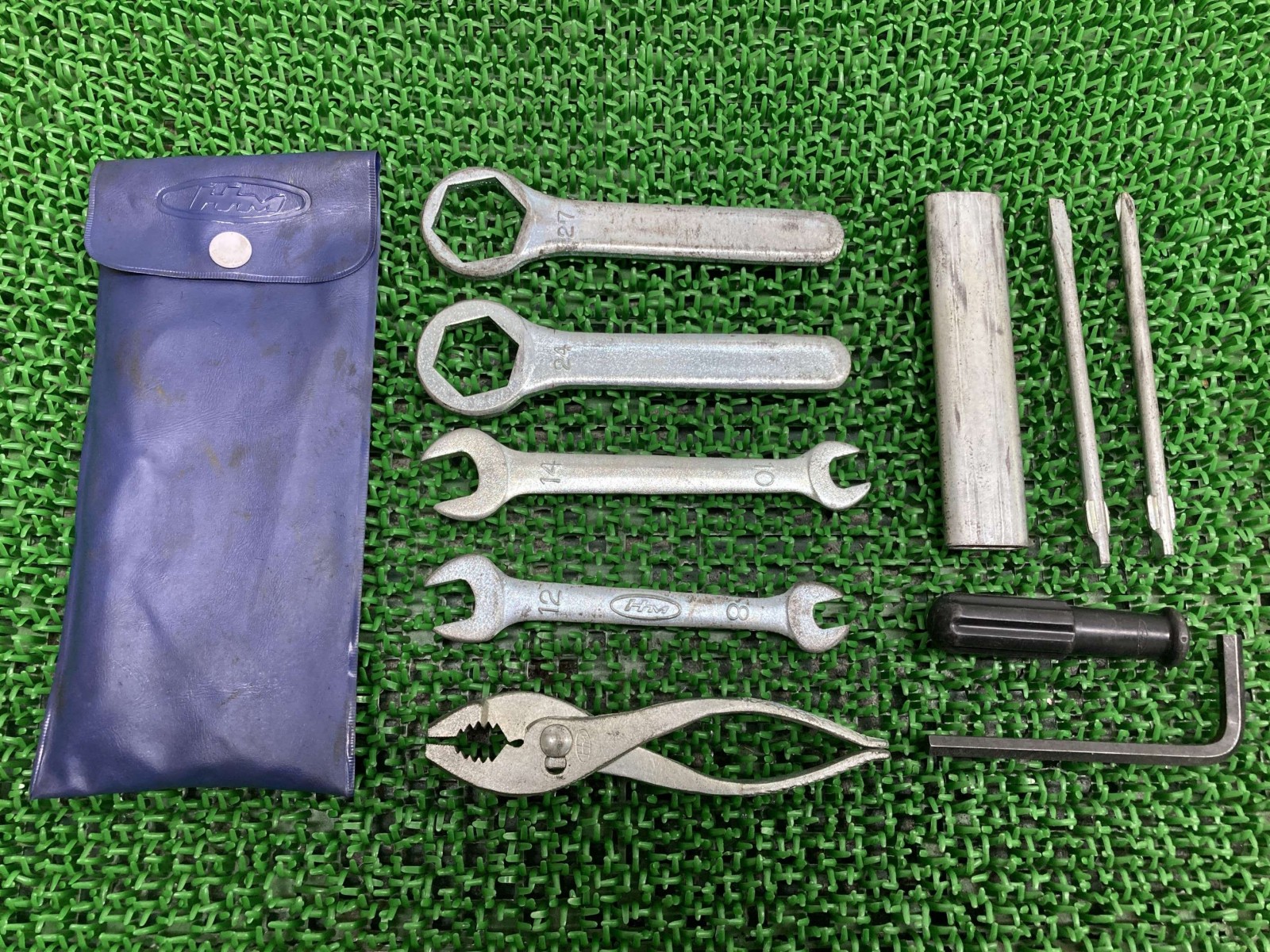 こちらの商品、写真でご覧の通り全体的に使用感とツールケースに破れ数ヶ所ございますが、機能上問題となる欠点ございません。 メンテナンス時や出先でのトラブル用に如何でしょうか? シート下やサイドカバー内などの収納スペースが空になっていませんか? 収納スペースに車載工具が1つあるだけで、ツーリング時や出先などで不意にトラブルが起こった際に役立ちますよ♪ 日頃のメンテナンスと同様に、万が一の備えにも気を配っておくと、安心してバイクの運転を楽しめるでしょう。 お探しの方、この機会にぜひどうぞ! 参考データ ●メーカー:ホンダ ●車名:ホンダ ※お届けする商品は写真に写っている物が全てです。