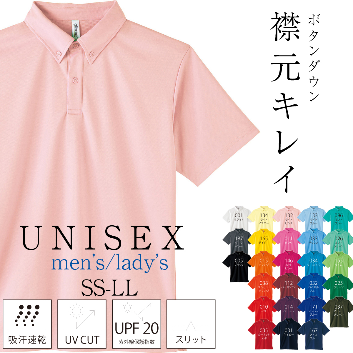 ポロシャツ 半袖 レディース ファッション メンズ ボタンダウン ポケット無し 吸汗 速乾 スリット UV SS S M L LL ポロ