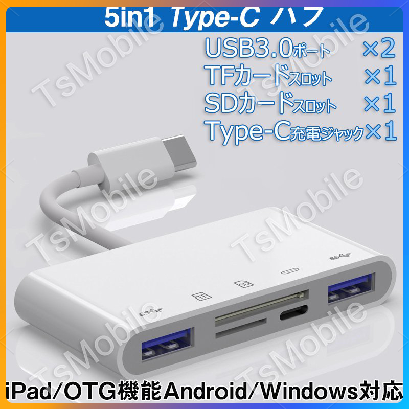 「本商品はOTG対応機種のみ使えますので、予めご了承ください。」品名:Type-C 5in1 SD/MicroSDカードリーダーUSB変換アダプタ標準:USB3.0材質:アルミ合金重量:40gインターフェイス:Type-C(OTG機能必要)メモリスロット:マイクロSD/TF/USB3.0サポート容量:256Gまで対応機種:TypeC搭載のiPad、タブレット、PC、パソコン、Samsung、Huawei、Xperia等のAndroidアンドロイドスマホ