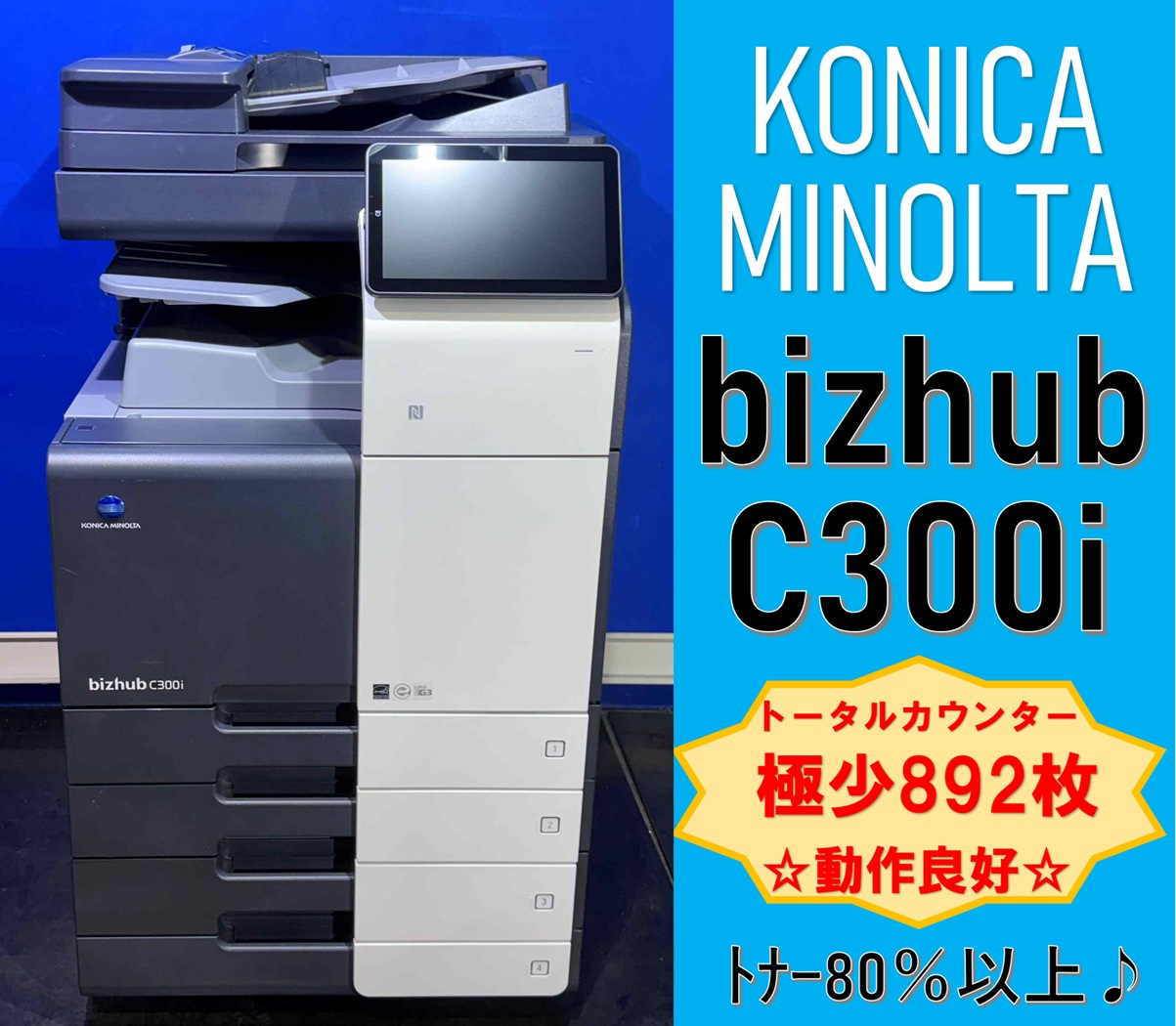 【越谷発】【KONICA MINOLTA】A3カラー複合機 ☆bizhub C300i ☆ 極少カウンター 892枚 ☆ 動作確認済み ☆(13311)