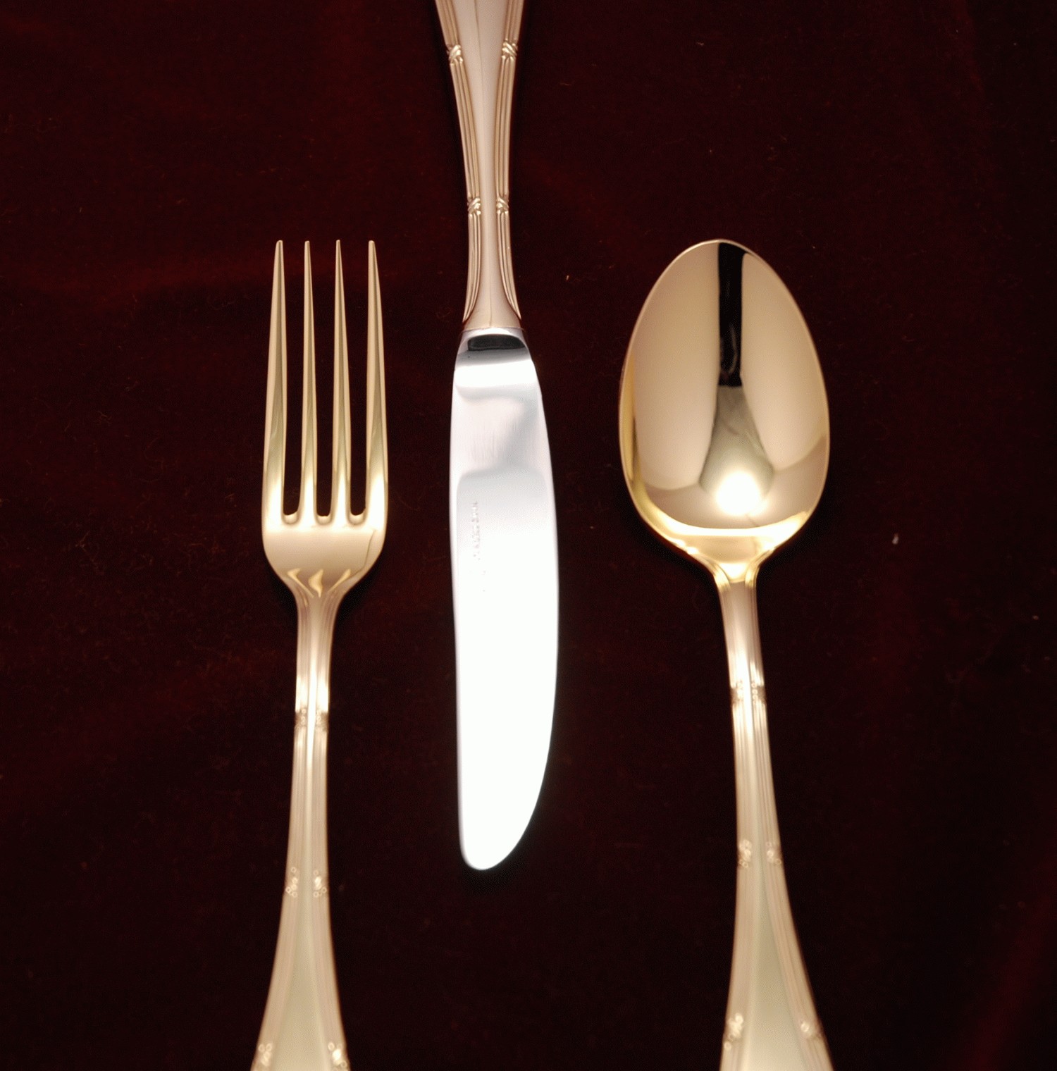 祝いの食celebratory dinnerにいかがでしょうか!!素材の18-8ステンレススチールにまだ残る鉄くささも純金メッキでコーティングされることによってカットアウト。味にこだわる方にも最適です!