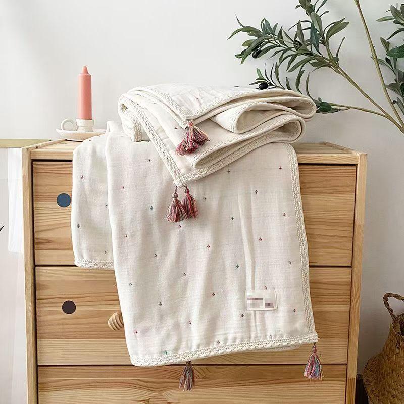 落ち着いた色合いでおしゃれなガーゼケット・フリンジがかわいい・吸湿 通気 無添加 肌にやさしい