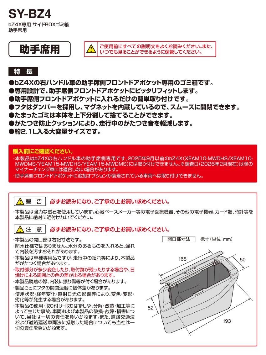 bZ4X 専用 サイドBOX ゴミ箱 車 助手席用 XEAM1# SY-BZ4 YAC