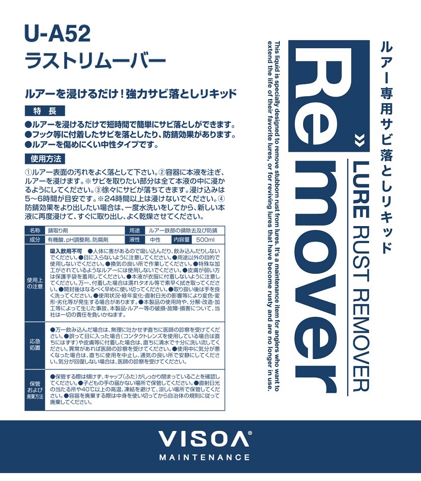 U-A52 ラストリムーバー ルアー専用 強力サビ落とし リキッド ルアーを浸けるだけ 防錆 肌や環境にやさしく 匂いも少ない 中性タイプ VISOA YAC