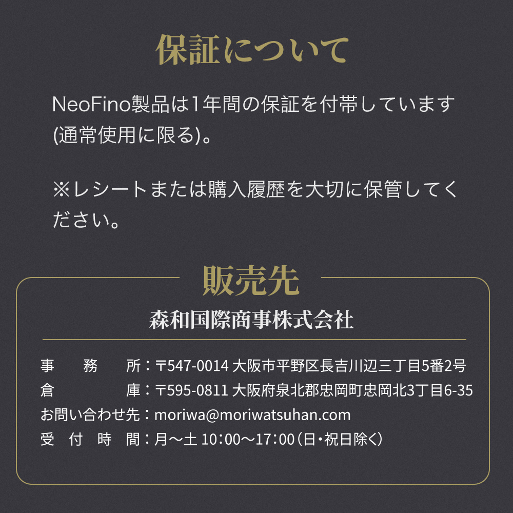 NeoFino製品は 1年間の保証 を付帯しています。