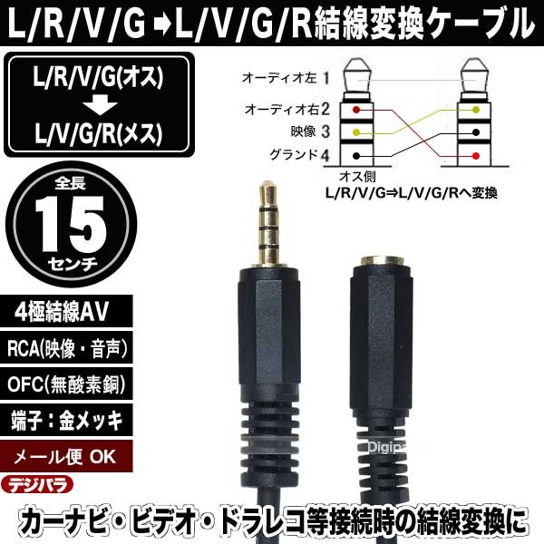 4極3.5mm結線変換ケーブルL/R/V/G→L/V/G/R長さ:15cm カーナビ・ドラレコ 小型AV家電 結線間違い等 COMON 435-OMTP/015