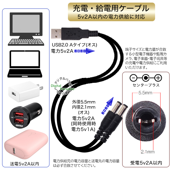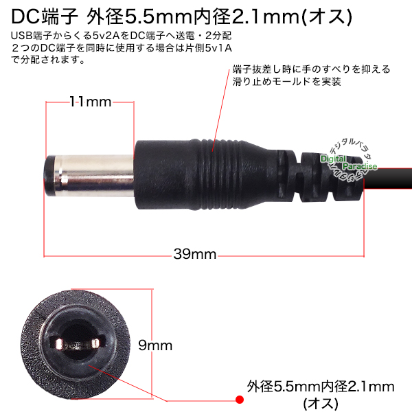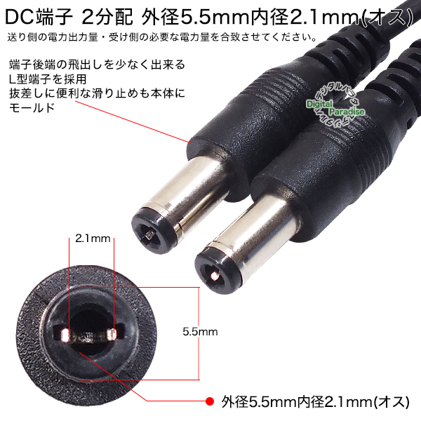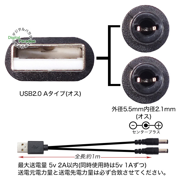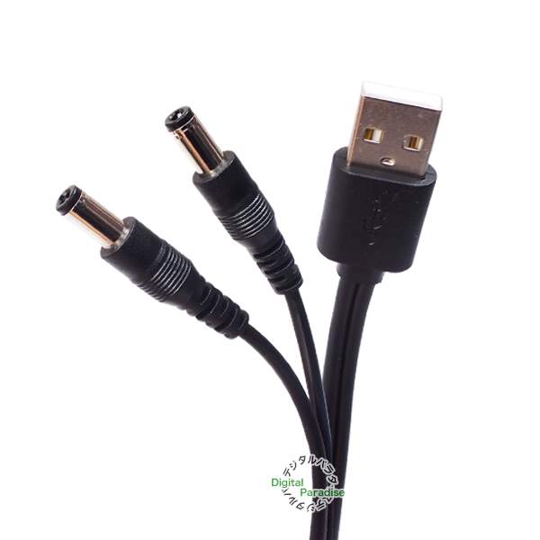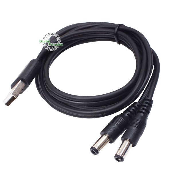 USB→DC電源分配ケーブル 外径5.5mm 内径2.1mm USB(オス)→DC 2分配電源ケーブル 1m DC端子への給電や充電用 電子楽器 車載機器 DCCA-2AM-5521-2Y10
