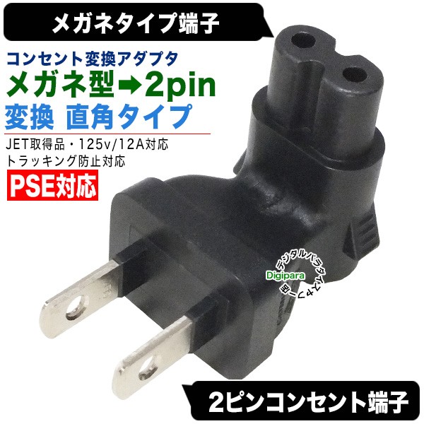 メガネ型2pin→2pinコンセント直角アダプタ めがねタイプ2ピンから家庭用コンセント2pinに変換 パソコンACアダプタ最短接続 PSE取得品 125v 12A COMON W-2PA