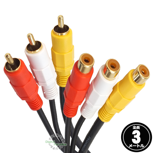 RCA映像・オーディオ端子(オス)⇔RCA映像・オーディオ端子(メス)延長ケーブル 3m