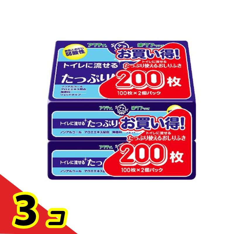 アクティ トイレに流せるたっぷり使えるおしりふき 200枚入 (=100枚×2個パック) 3個セット