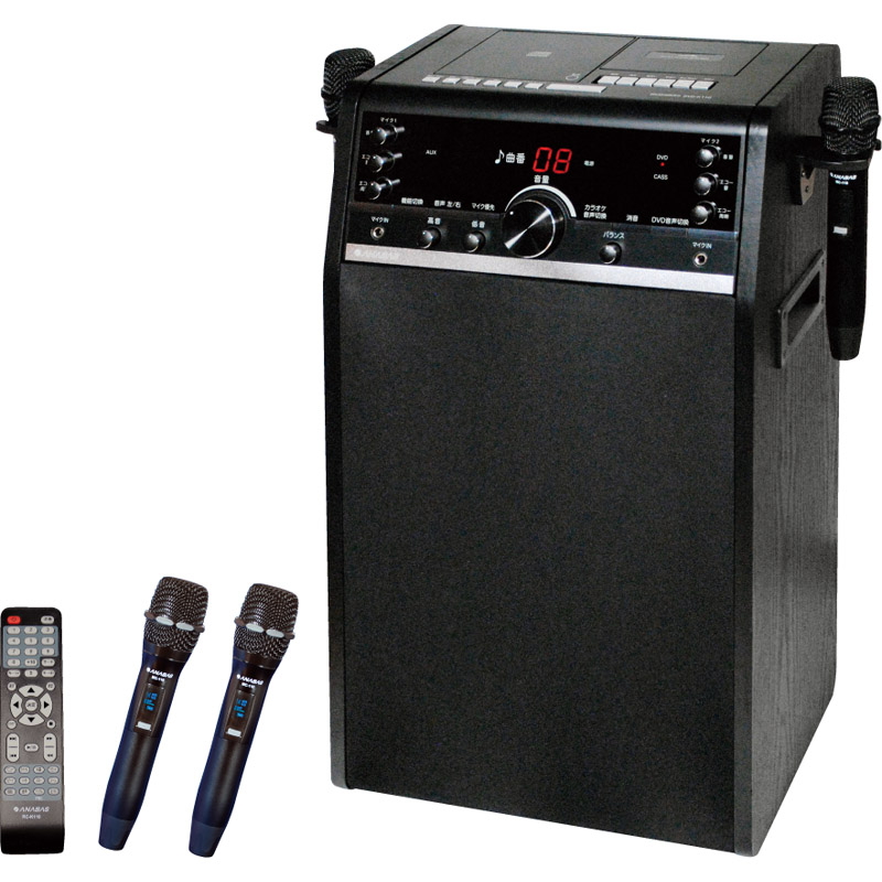 テレビに接続してDVDカラオケが楽しめます・到達距離約40mの本格的ワイヤレスマイク・大出力58W・25cmの巨大ウーハー・9.8cmツイーターを搭載・練習に最適、歌ってカセットに録音できます・キーコントロール機能・外部入力端子・出力端子装備・音楽用CDも再生できます・AC100V−15W