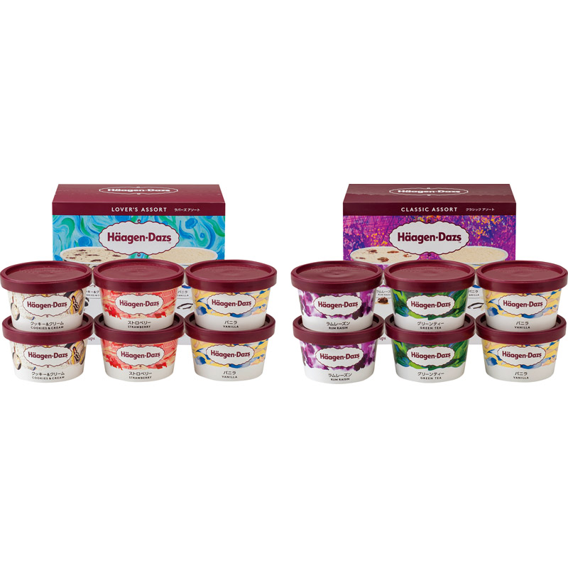 ハーゲンダッツで人気のフレーバー3種類が入った"ラバーズアソート"と、こだわりの素材を使用した大人向けフレーバー3種類が入った"クラシックアソート"をセットにしてお届けします。