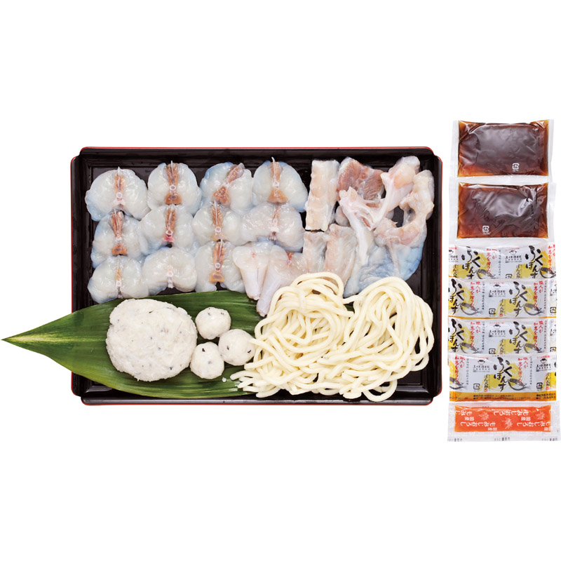 内容:まふくちり身・アラ500g、とらふく入りつみれ200g、とらふく入りうどん250g、ふく鍋だし45g×2、ポン酢35g×4、モミジオロシ16g