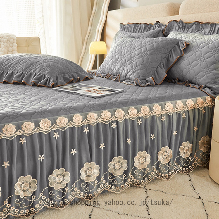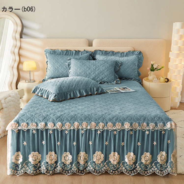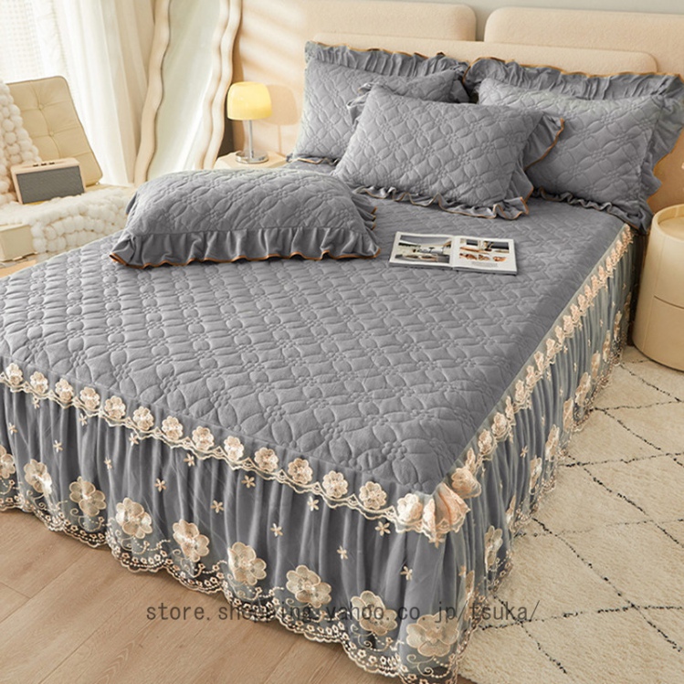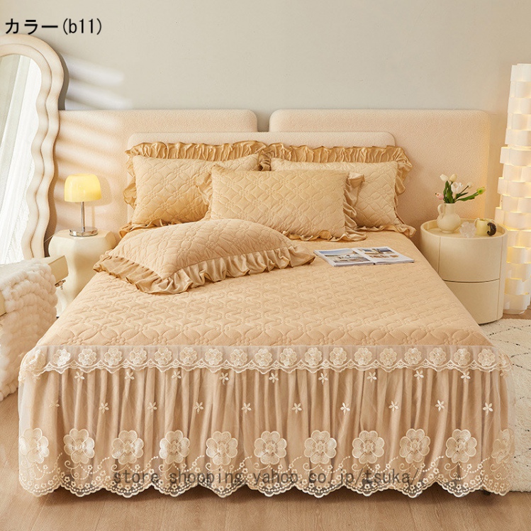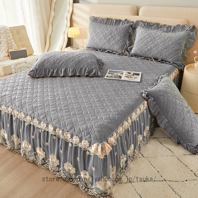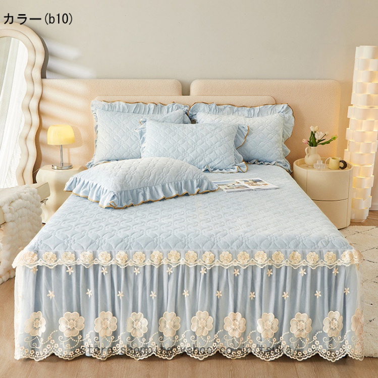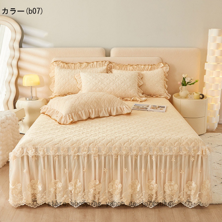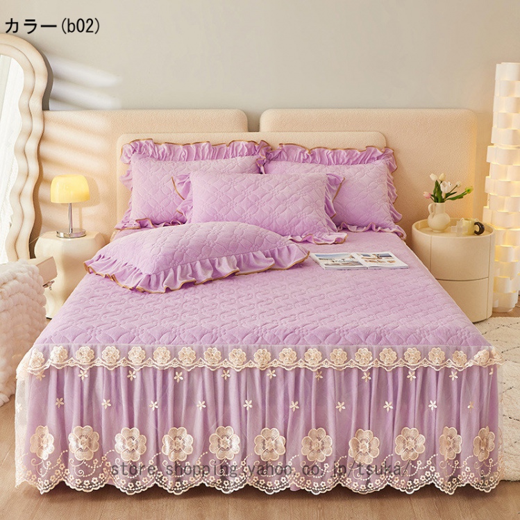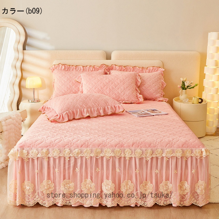 ベッドスカート 綿 キルティング マットレスカバー 枕カバーセット フリル付き 敷パッド一体型 中綿 姫系 ズレ防止 春 秋 冬 洗える セミダブル ダブル