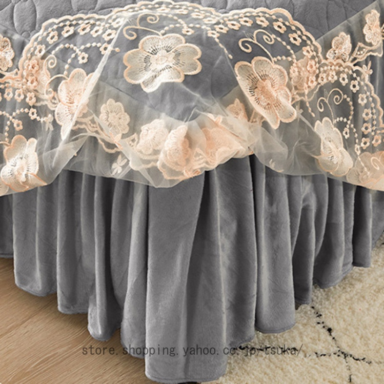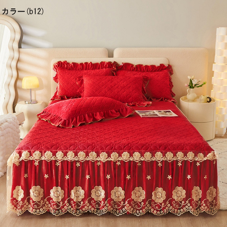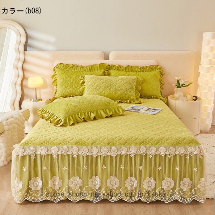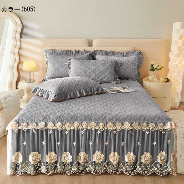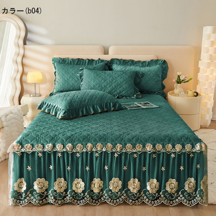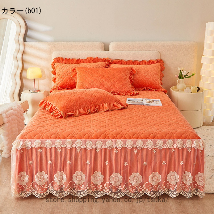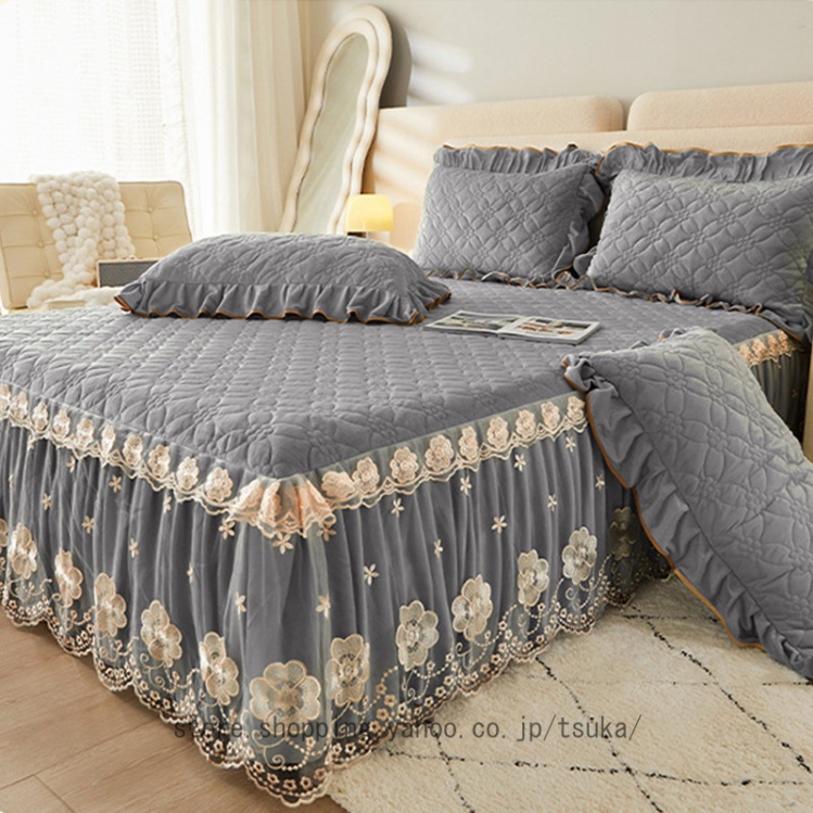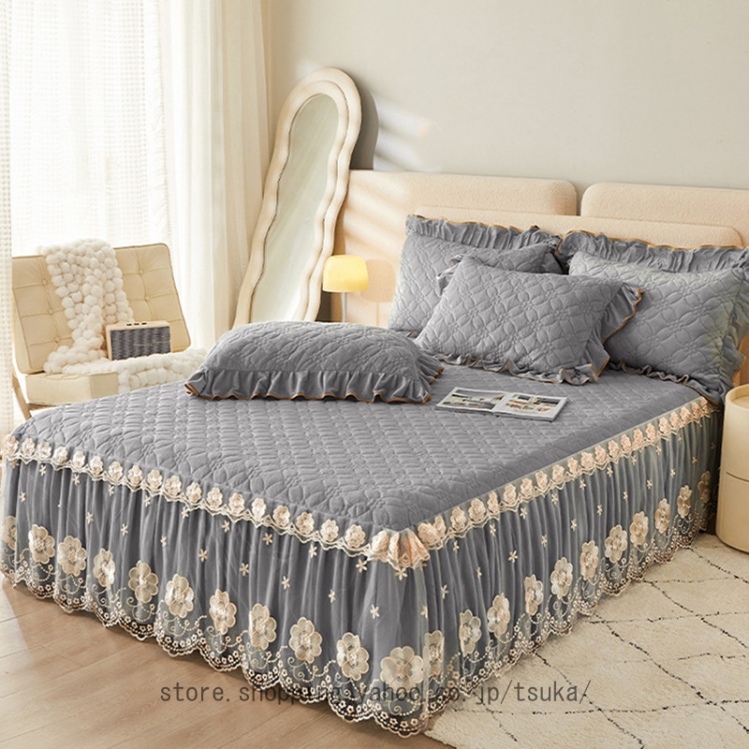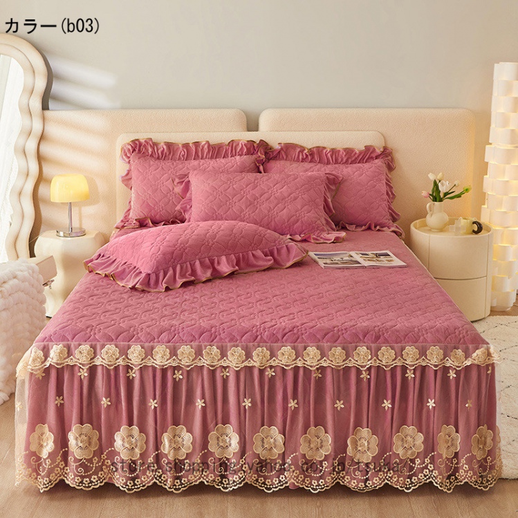 ベッドスカート 綿 キルティング マットレスカバー 枕カバーセット フリル付き 敷パッド一体型 中綿 姫系 ズレ防止 春 秋 冬 洗える セミダブル ダブル