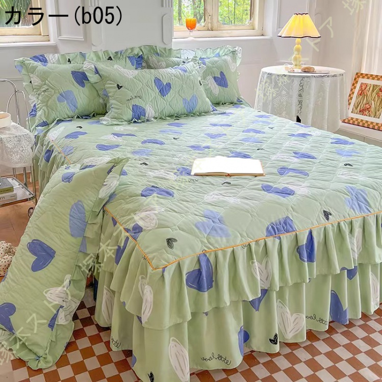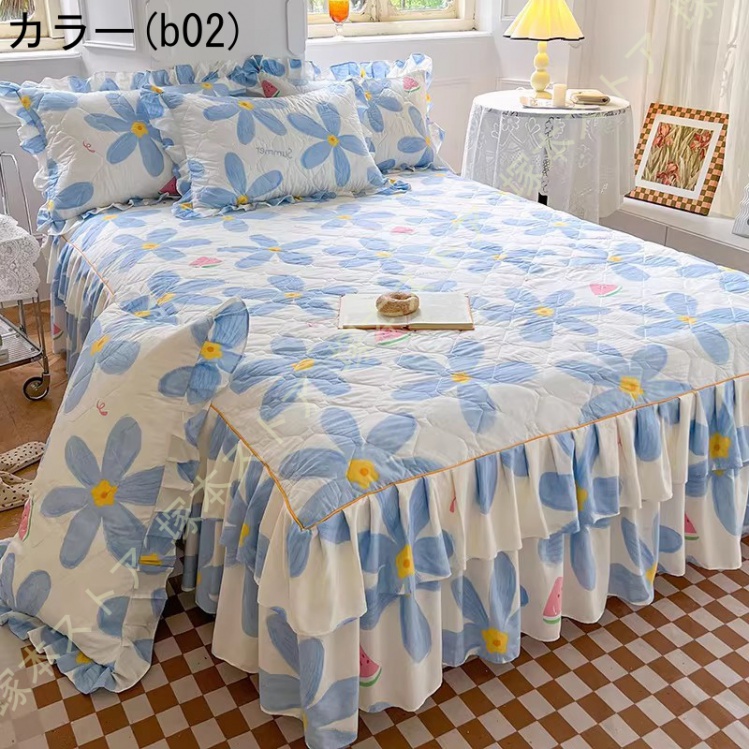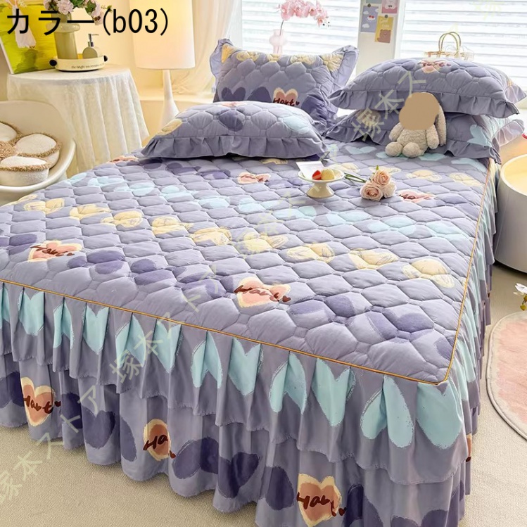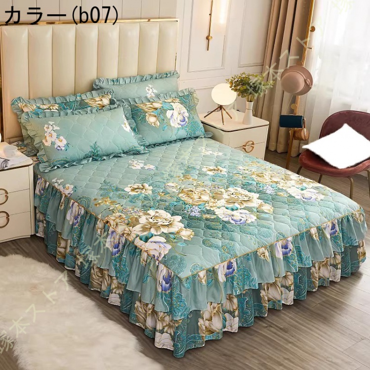 ベッドスカート 2点枕カバー 中綿 キルティング 中綿 上品 厚め 姫系 レース ベッドカバー 秋冬 暖かい レース フリル 柔らか ダブル キング マットレスカバー