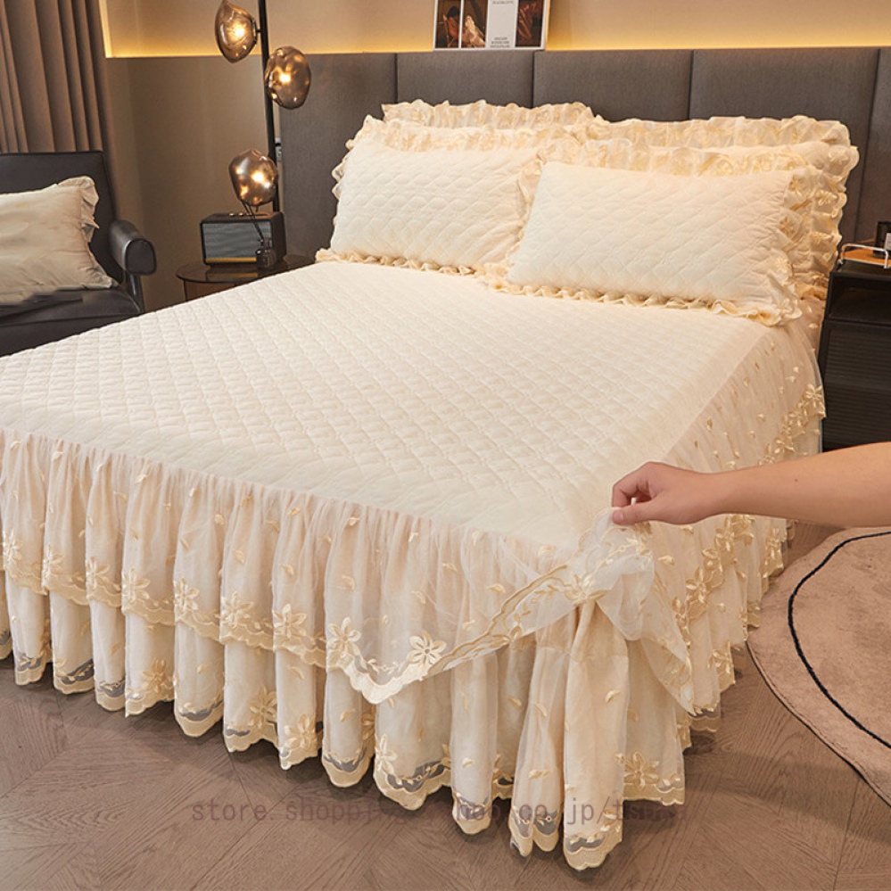中綿ベッドスカート ベッドスカート 無地 キルティング フリル ダブル シングル 柔らかい クイーン キング 大きいサイズ きれいめ 上品 レース ベッドカバー
