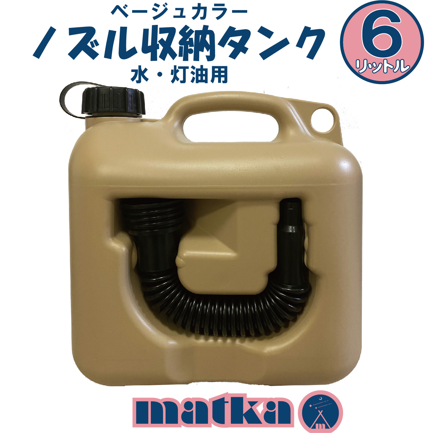 matka(マトカ)『ノズル付きポリタンク6L』PL保険加入商品。ベージュ色。ノズル収納式なのでコンパクト。アウトドア、防災時、災害時、DIY、キャンプ等さまざまなシーンにお使いいただけます。キャップ口径50mm。ツル付きキャップで紛失防止。キャップの凹凸が大きく老若男女問わず開閉しやすい形状!ノズル先端注ぎやすい口径15mm。※水などの入っていない空の状態でのお届けとなります。使用前に取扱説明書をよく読み、直射日光を避けて保管してください。※事故防止のため、5年以上は使用しないでください。