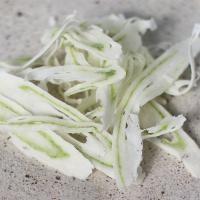 うすーく削った鱈のすり身とわかめで作った魚肉シートに、わさび風味を付けています。