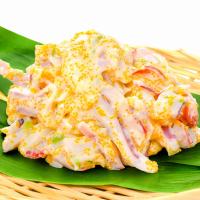 【原材料】いか(ペルー)、半固体状ドレッシング(食用植物油脂(大豆を含む)、卵、醸造酢(りんごを含む)、その他(乳成分を含む))、カナダほっき貝、カラフトししゃも卵、還元水飴、白とり貝、食塩、ヒトエグサ、砂糖混合異性化液糖、たん白加水分解物(ゼラチンを含む)、カキエキス/増粘剤(加工でん粉、増粘多糖類)、調味料(アミノ酸等)、酸味料、カロチノイド色素