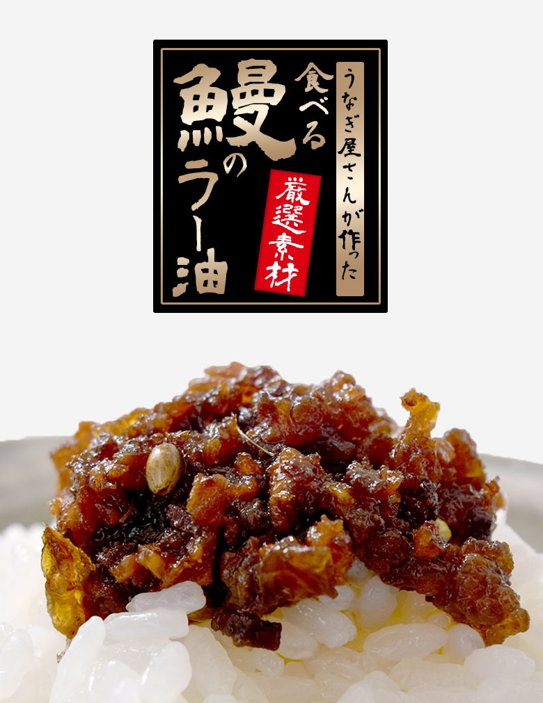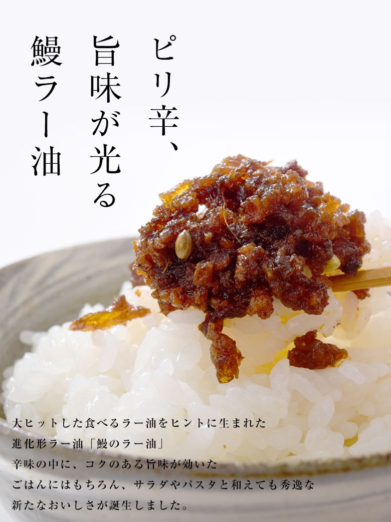 そんな中生まれたのが「食べるラー油」ミンチ状になったうなぎの蒲焼が入っています。うなぎの強い旨味とコクが、ラー油の辛みと相まってごはんが止まらない、新しい食べるラー油が生まれました。