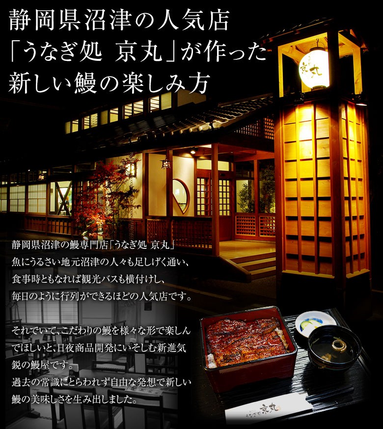 静岡県沼津 魚にうるさいこの町で行列のできるうなぎ処 京丸自社で仕入れた自慢の美味しい鰻をたくさんの人に楽しんでいただこうと、新しい鰻の楽しみ方を日々模索しています。