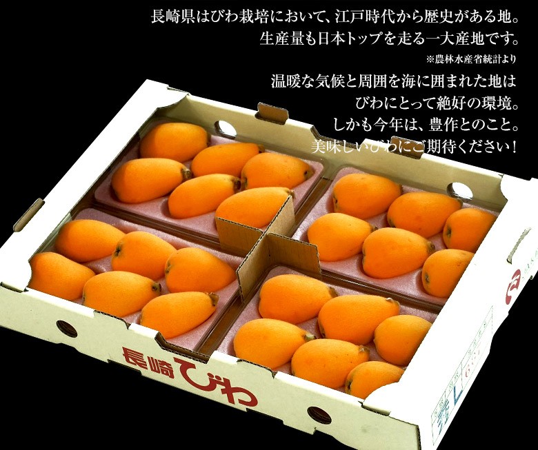 」びわの一大産地・長崎県の「長崎早生」「茂木」などの品種を、ハウス栽培で大切に育てた、季節先取りの美味しさ。