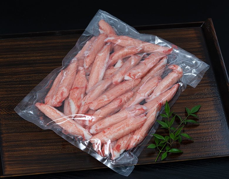 タラバガニのような太くて食べ応えのあるカニカマです。 業務用の飾り気のないパッケージですが、市場人も太鼓判の美味しさ。 大ボリューム1kgです。 厳選された原料 スケソウダラを使い、蟹風味に味付けし、見た目も蟹に整えました。 思ったよりも「蟹」で仕入れ人も驚きました。