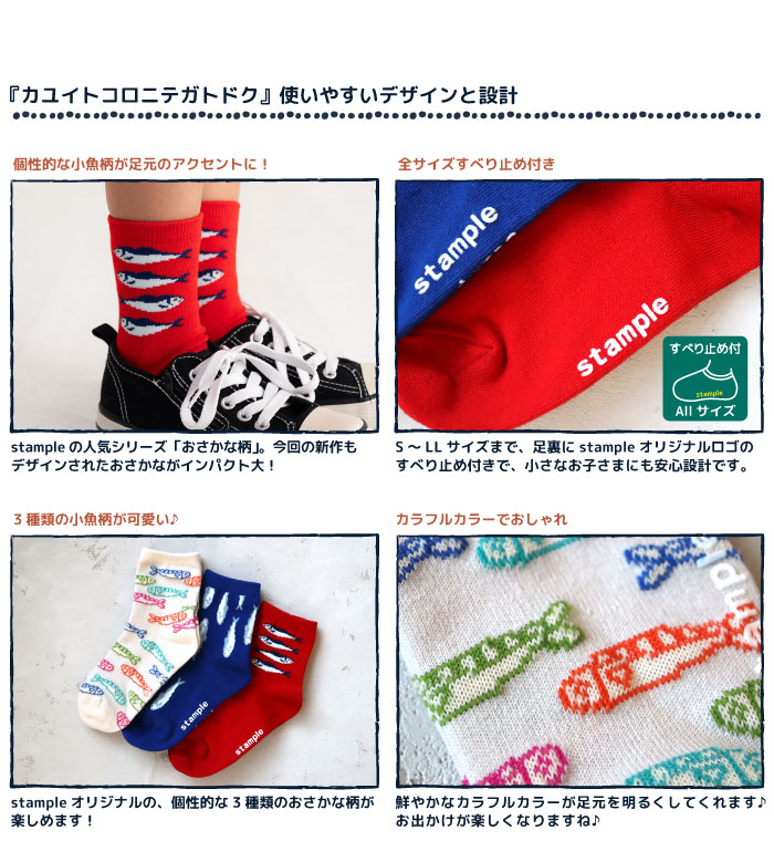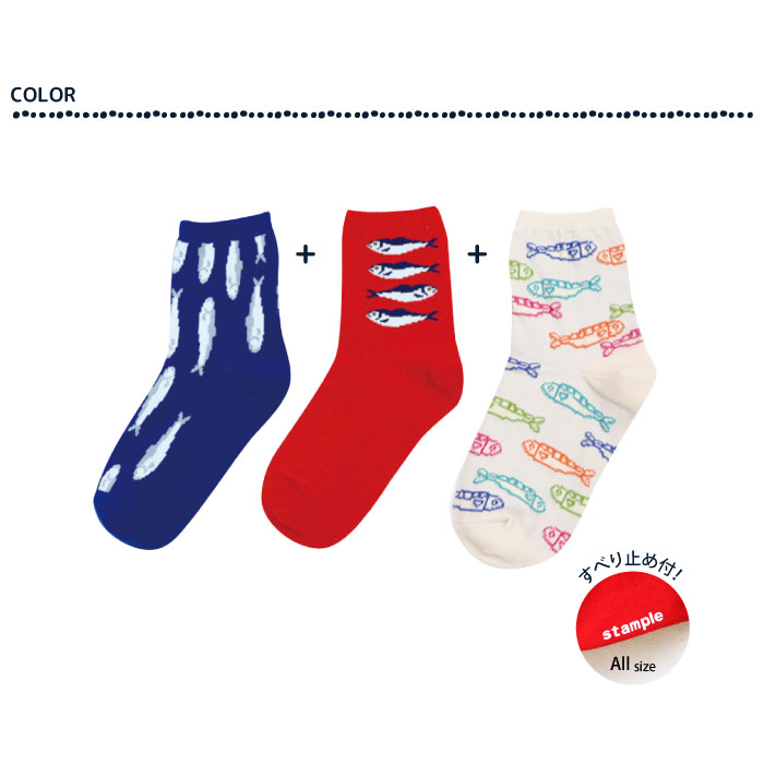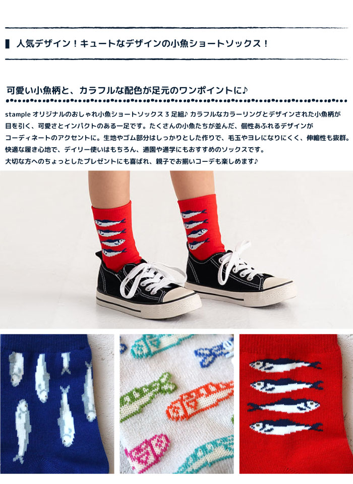 stample スタンプル 73398 おしゃれ小魚ショートソックス 3足組 魚 さかな おさかな 靴下 子供 キッズ 女の子 レディース 男の子 滑り止め