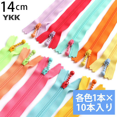 お試し10本セット 玉付きファスナー コイル 14cm カラフル 各色1本 玉付ファスナー 玉付 ファスナー YKK