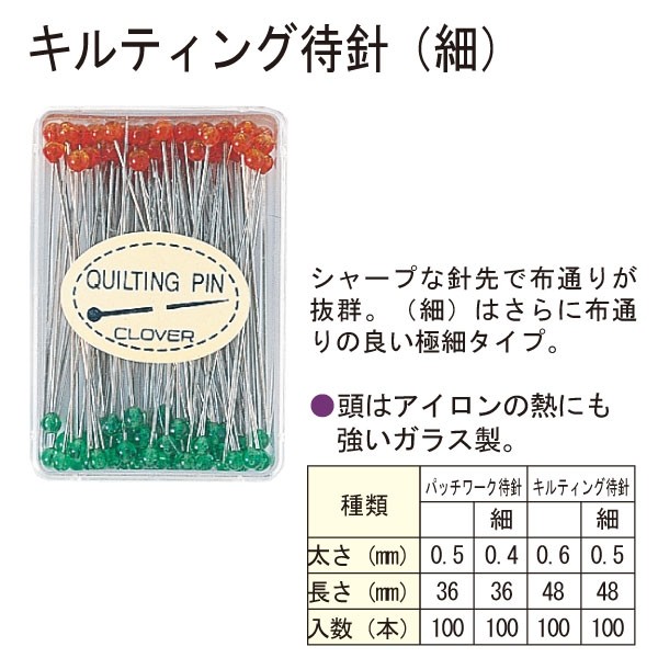 頭はアイロンの熱にも強いガラス製。シャープな針先で布通りが抜群。(細)はさらに布通りの良い極細タイプ。