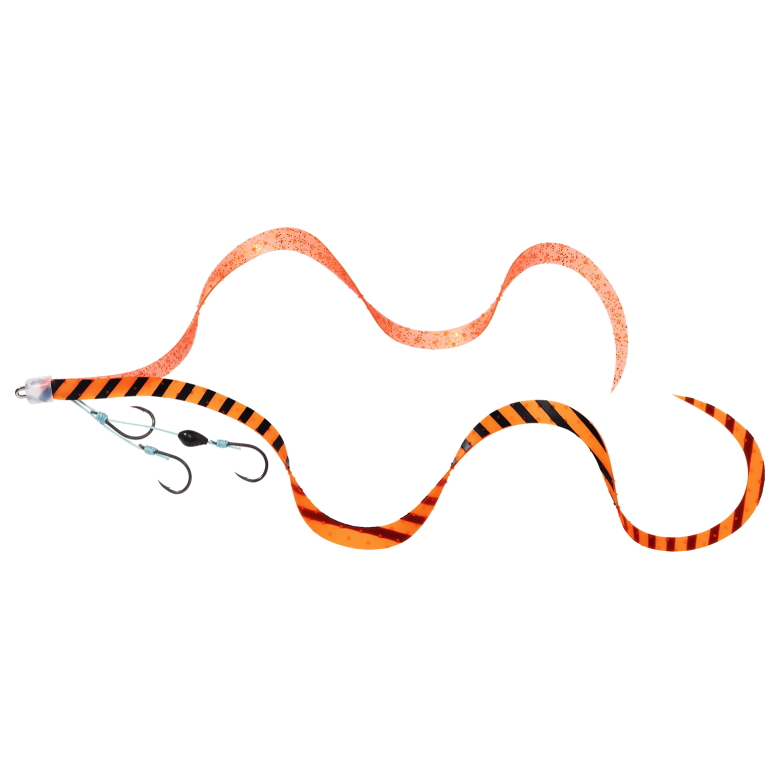 ダイワ独自の3D素材を採用したかつてない超ロングネクタイの「紅牙シリコンネクタイ3Dやり過ぎカーリー」と3本針を採用した替えユニット。