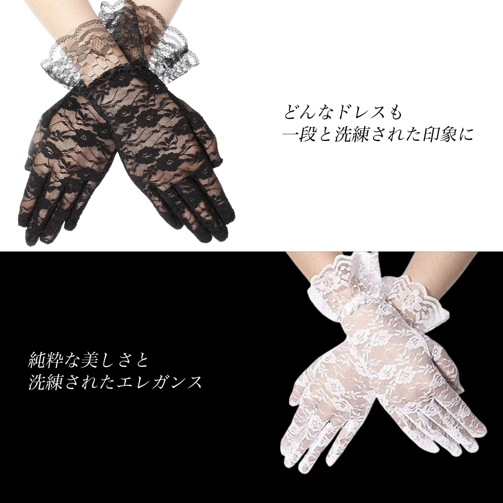 結婚式 冠婚葬祭はもちろん、パーティー 演奏会 二次会 仕事用ステージ衣装 ドレス 撮影用 ハロウィン コスプレなど、様々なシーンにマッチする白いレースと黒いレースの手袋。夏用 日除け UVカット、レディース用として最適です。エレガントな総レース手袋で、あなたのファッションに上品さを加えましょう。