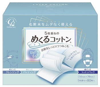 独自の技術で5枚重ねにしたコットンは、 化粧水をつけると毛羽立たず5枚にめくれて、そのままコットンパックをするのにとても便利。