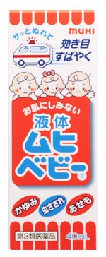 ●特 徴:液体ムヒベビーは、お子さまのお肌の性質とかゆみの特徴にあわせて開発された、すばやい効き目とお肌へのやさしさをあわせもつ、液体タイプのかゆみ止めです。