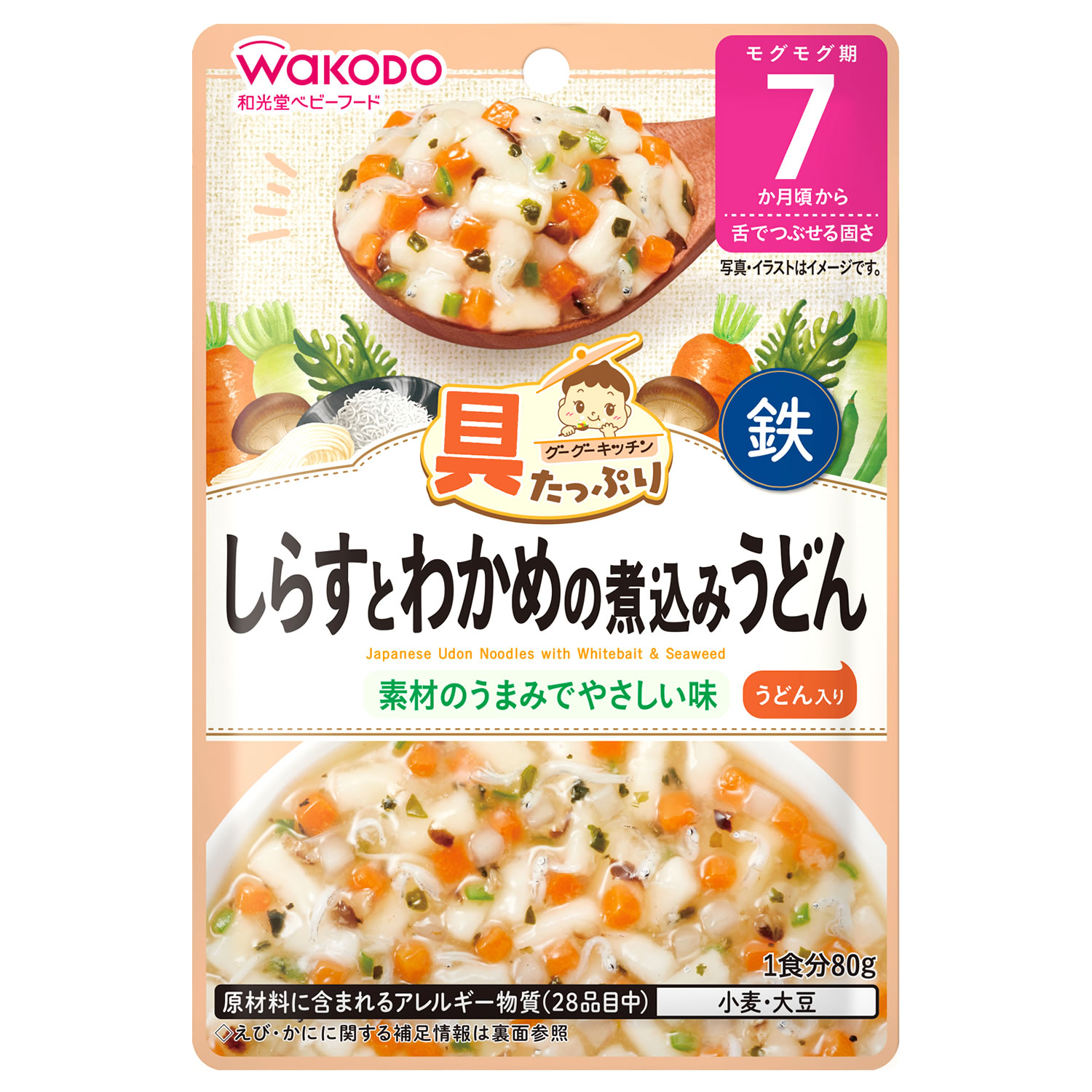 ●原材料:野菜(にんじん(国産)、だいこん、さやいんげん)、うどん(小麦を含む)、かつお昆布だし、しらす、しょうゆ(大豆を含む)、ぶどう糖、しいたけ水煮、乾燥わかめ/増粘剤(加工でん粉)、ピロリン酸鉄
