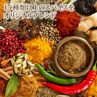クミン、ターメリック、唐辛子、コリアンダー、スターアニス、カルダモン、クローブス、フェネグリーク、胡椒や陳皮など、15種類以上のスパイスをオリジナルブレンド。