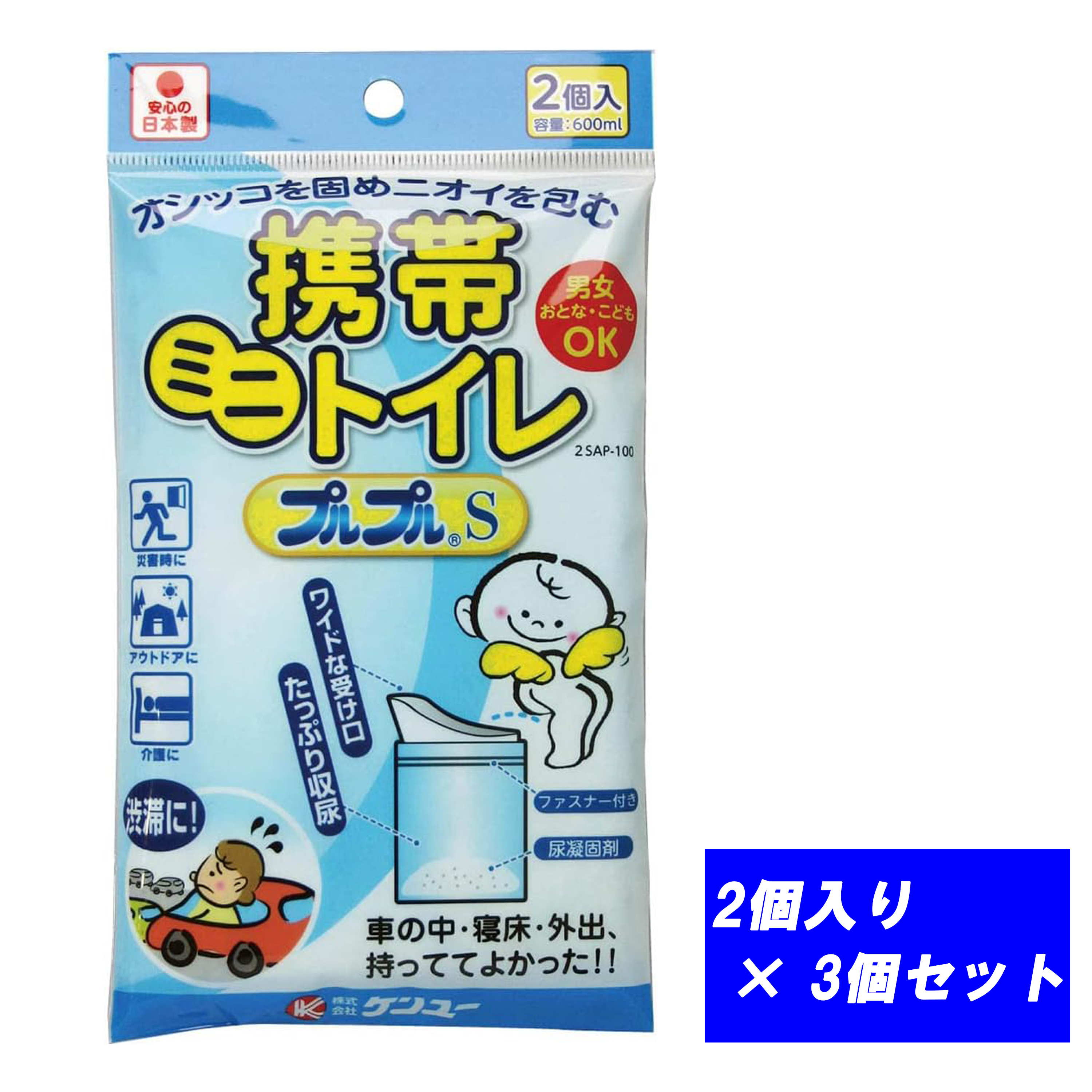 n_【3個セット】 携帯用トイレ ケンユー 日本製 携帯ミニトイレ プルプルS 男女兼用 凝固剤入り 容量600mL 2個入り