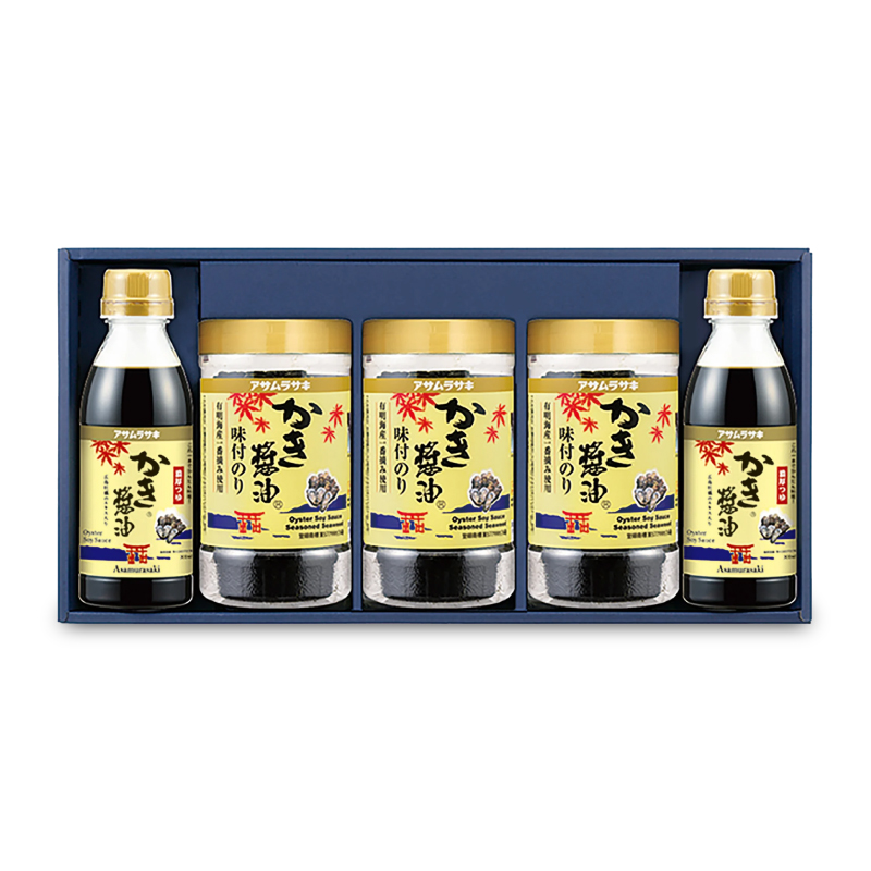 新鮮な広島牡蠣から旨味エキスを抽出し、本醸造醤油とブレンドした高級濃厚つゆ「かき醤油」と「かき醤油味付のり」を詰め合わせた人気のセットです。