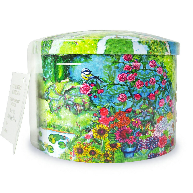 まるで絵本の世界を描いたような、イギリスの庭園をイメージしたカントリーガーデン缶に、クリームファッジを詰めました。