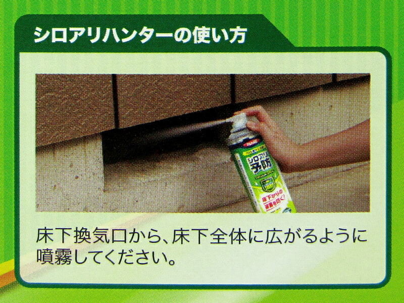 ・15ー20m²あたり1本の割合で、床下換気口から床下全体に噴霧してください。特に、風呂場や台所付近の床下換気口からは十分噴霧してください。
