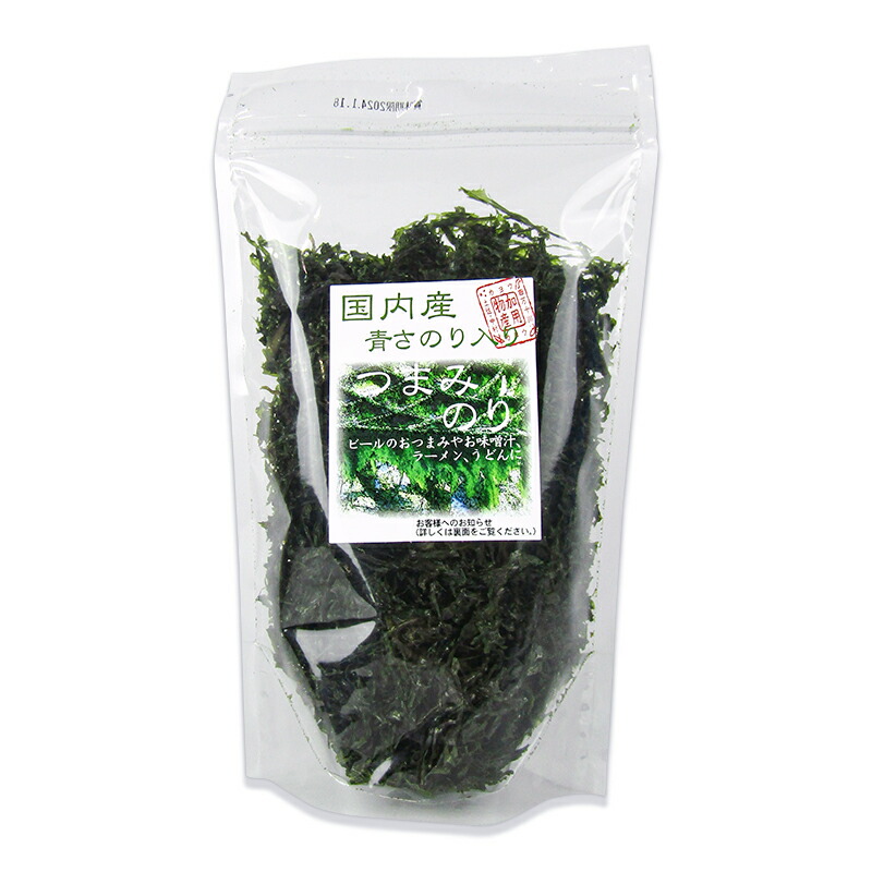 国内産焼きあまのり、国内産青さのりを混ぜてそのまま袋詰めにしています。通常青さのり単体ですと使用方法がみそ汁等の一度水に戻すタイプになりますが、本品はあまのりを主原料にすることでそのまま食べていただけます。色鮮やかで風味がよく、柔らかい海苔を厳選しております。