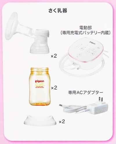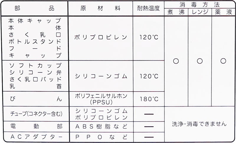 | ご使用上のご注意 | ・ご使用後、乳首やびん、各部品は洗剤やブラシを使用して十分に洗浄した後、消毒を行ってください。ただし、シリコーン弁はブラシなどを使用せず、やさしく洗浄してください。強い力を与えると破損の原因となることがあります。 ・火のそばに置かないでください。変形することがあります。 ・電動部は韓国製、ACアダプターは中国製です。その他部品の生産および商品の組み立てはピジョン株式会社タイ工場で行っています。 |