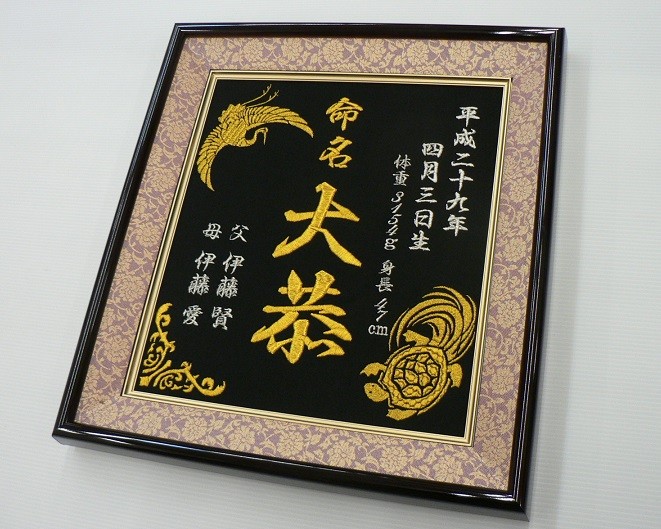 贈られる方のお名前、生年月日や寄贈日、贈る方のお名前などを刺しゅうでお入れするので、豪華な仕上がりとなり大変喜ばれます!